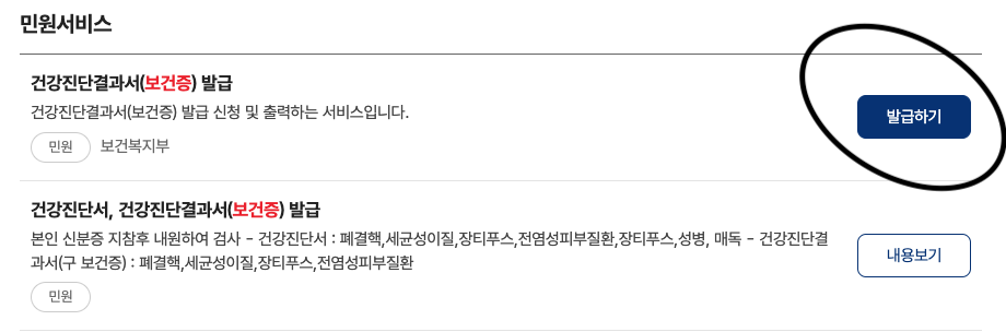 위에 버튼을 눌러 보건증 발급 서두르세요. 링크 들어가면 민원서비스 창에 발급하기를 눌러서 발행하세요. 요즘 사람들이 많이 정부24홈페이지에 들어가서 웹사이트가 안되니 서두르세요!